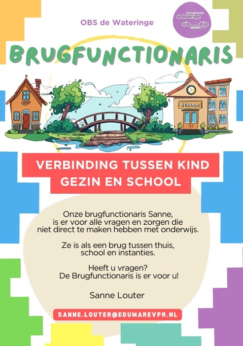Op obs de Wateringe vinden we het belangrijk dat ieder kind zich goed voelt – op school én thuis. Soms zijn er vragen of zorgen over school, opvoeding of de thuissituatie die invloed kunnen hebben op het welzijn van een kind. Daarom hebben wij een brugfunctionaris op school.
